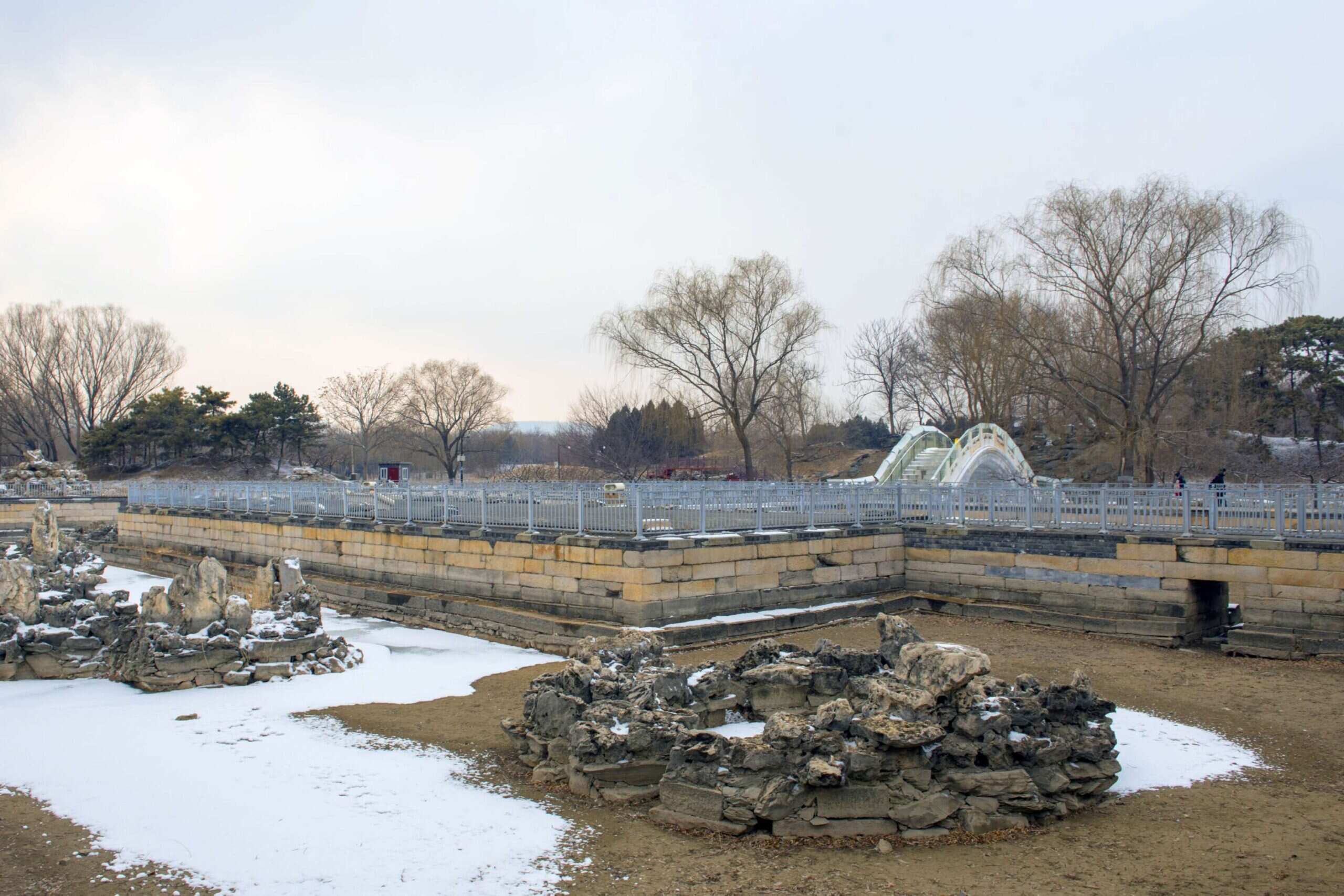 圆明园殿为九洲清晏建筑群的门殿,从乾隆九年的圆明园四十景图可知其为一座五开间歇山顶殿宇,当中3间开隔扇门,两侧2间为支摘窗,直到道光十六年失火前。当时该建筑平面为带前廊,后廊被封入室内,当中3间在后檐柱缝设有隔扇门,两梢间与当中3间有墙相隔、进入梢间的门设在后檐柱间。南立面与乾隆九年无异。道光十七年的重建设计平面图中的变化主要是后廊当中三间微开,隔扇门移至金柱缝,梢间仍然将廊步封入室内。明间在后金柱前设有宝座,有如室内厅堂,从当中三间可以直接进入两梢间,但其北侧的门改成实墙,同时将两侧的山墙做成带墀头的形式,据此推测这时的屋顶已经改成硬山顶。