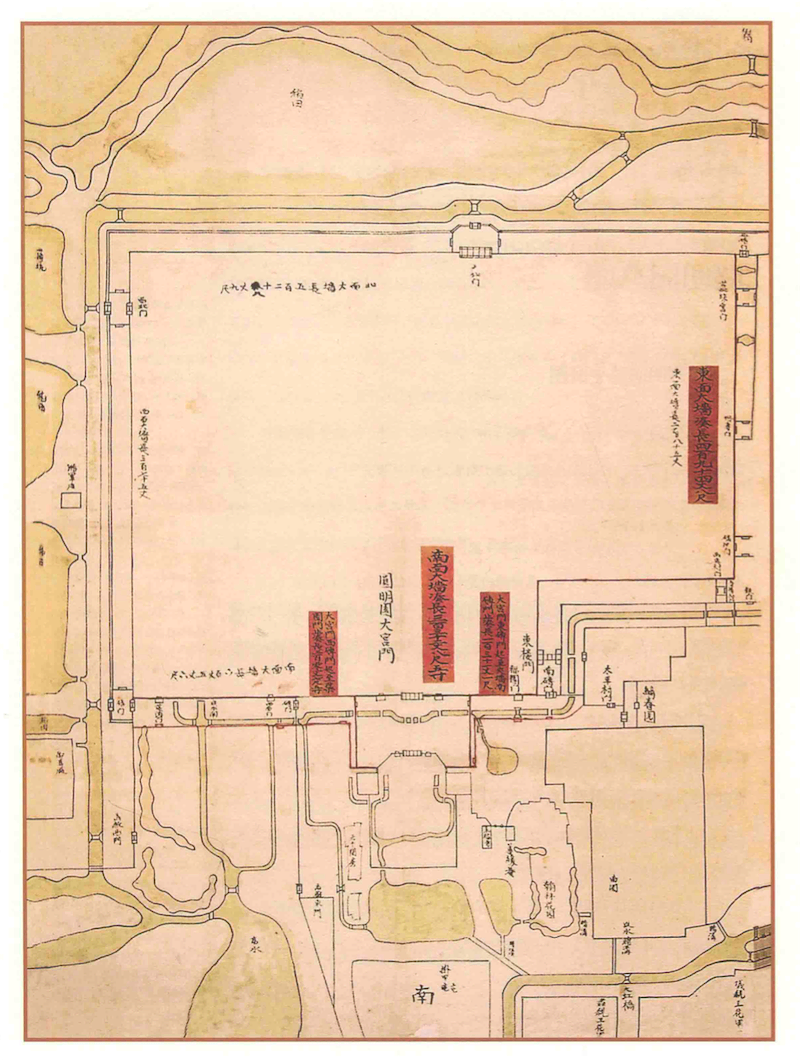 将此图与反映威丰八年圆明三园总体格局的故宫博物院所藏样2517图相比较,可以发现∶ 流香渚与海岳开襟间尚没有出现后期的大桥,玉玲珑馆、线法画、法慧寺、延清堂、绿油门内建筑也略有差异。表明此图绘制时间要早于咸丰八年。