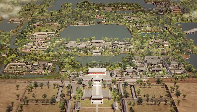 本图局部有残破,绘制比例约为1∶200。图上以墨线绘制出山水和建筑群的轮廓,贴黄签标注各景区名称,原为呈样;图上潦草标注的红、黑两色泊岸尺寸数据以及2处河道修改 ...
