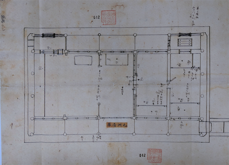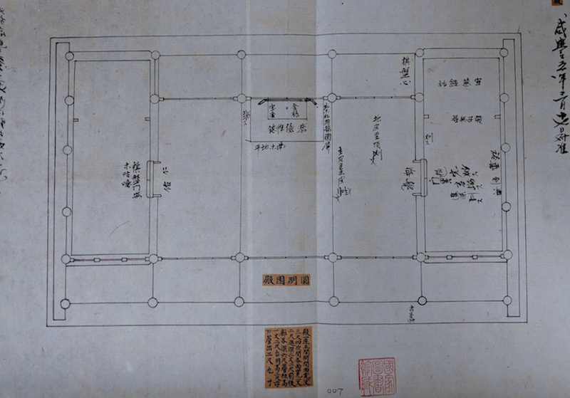 这张图右下标有“咸丰元年八月二十六日改,二十七日再听办理”,由此可知是于咸丰元年利用旧样绘出改建的设计过程图,从图中可以看到与道光十六年之间的变化,图上在咸丰元