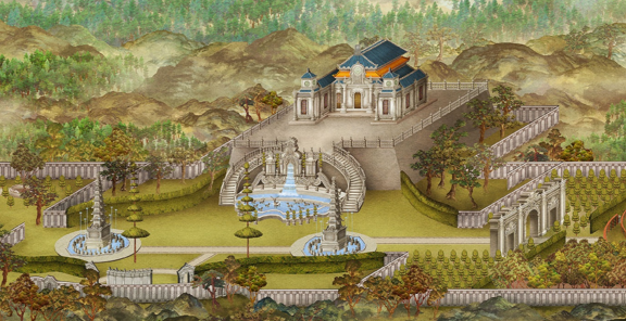 线法山东门,即西洋螺蛳牌楼门,东临方河,西为线法山西式亭。从老照片上看,牌楼门墙体应为彩色抹灰,门券与立柱为大理石原色,虽然顶部西洋军鼓、刀箭、盾牌、盘蛇等装
