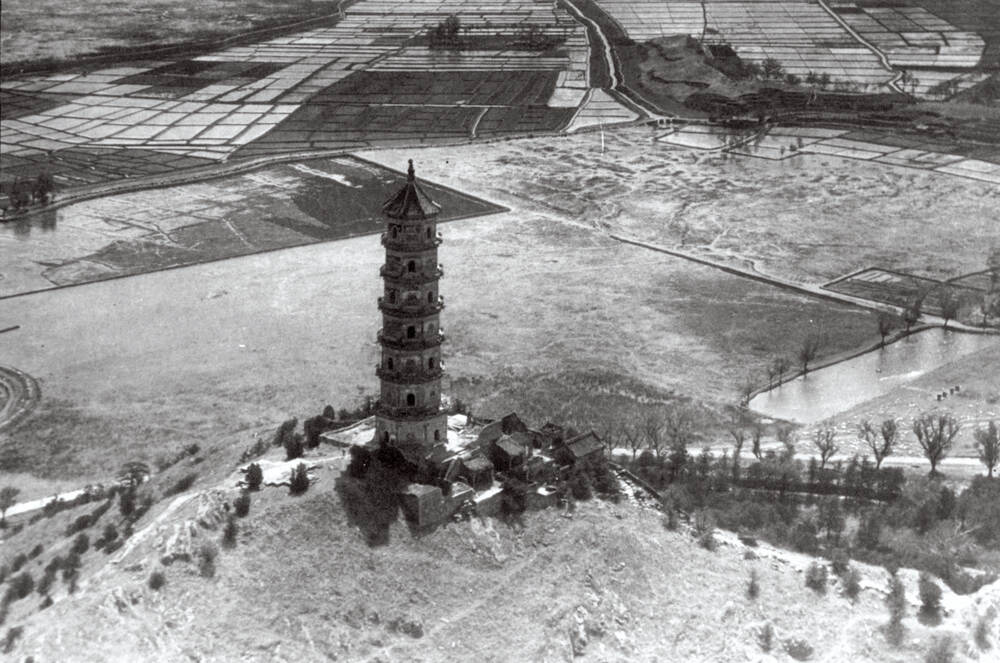 拍摄于20 世纪30 年代的旧照,两名女子带着一个小孩子在玉泉山半山腰席地而坐。 20 世纪30 年代从高空俯拍的静明园定光塔,此时塔北面的十字亭已经只剩下 ...