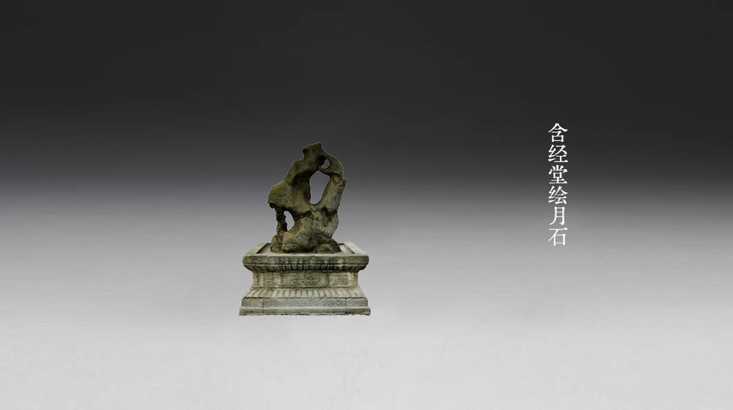 此太湖为人工凿剔而出,石身均匀分布着大小不一的孔洞,正中居上的大孔洞形似一轮明月当空照,乾隆帝爱之有加,亲笔御题“绘月”二字。须弥座上枋及下枋镌刻如意云头连续,